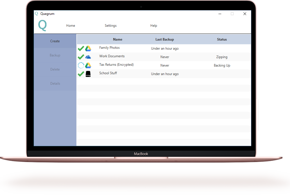 Just choose the files you wan't to protect and Quagurm will take care of the rest. It will work in the background to reliably back them up.